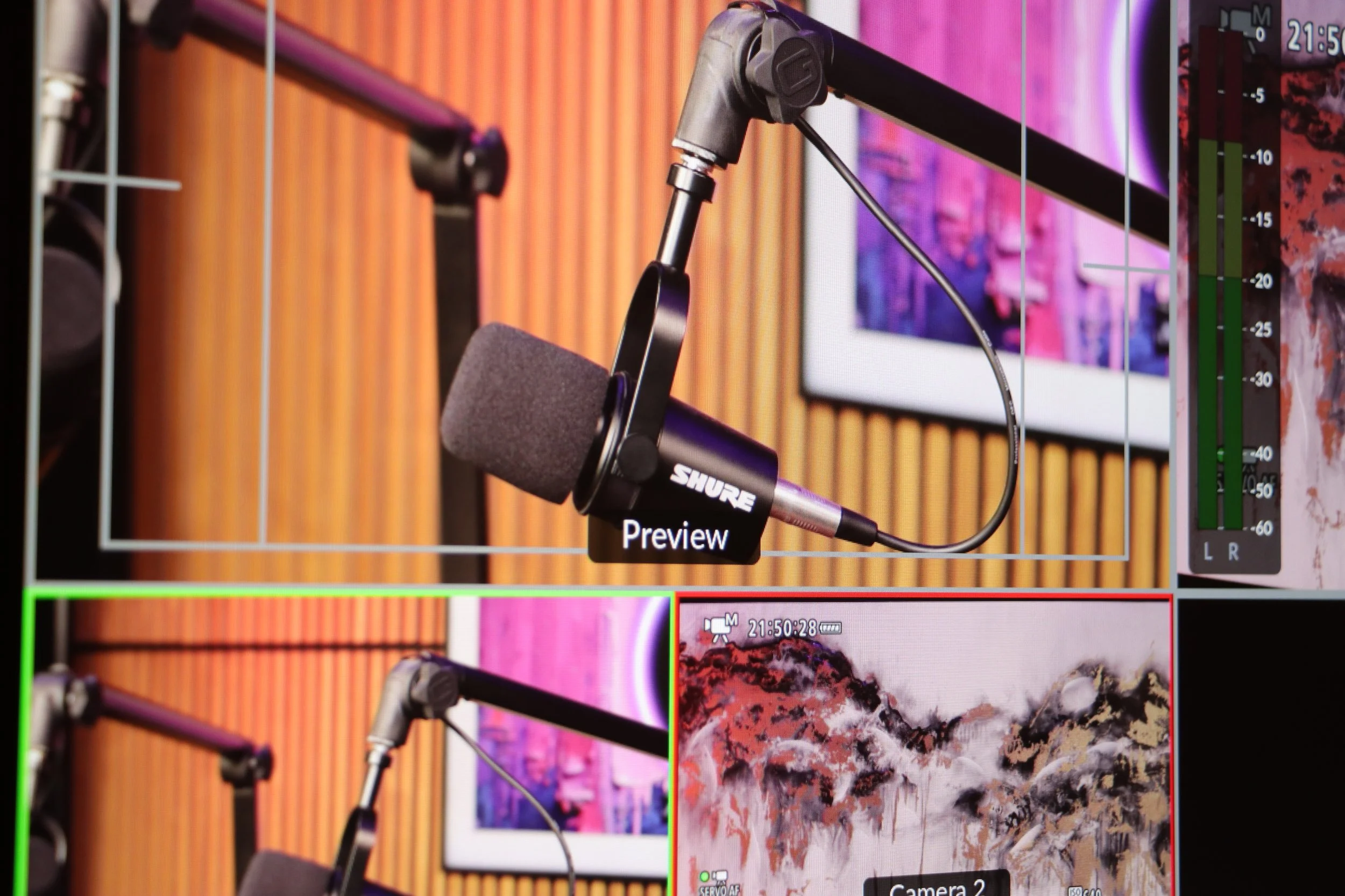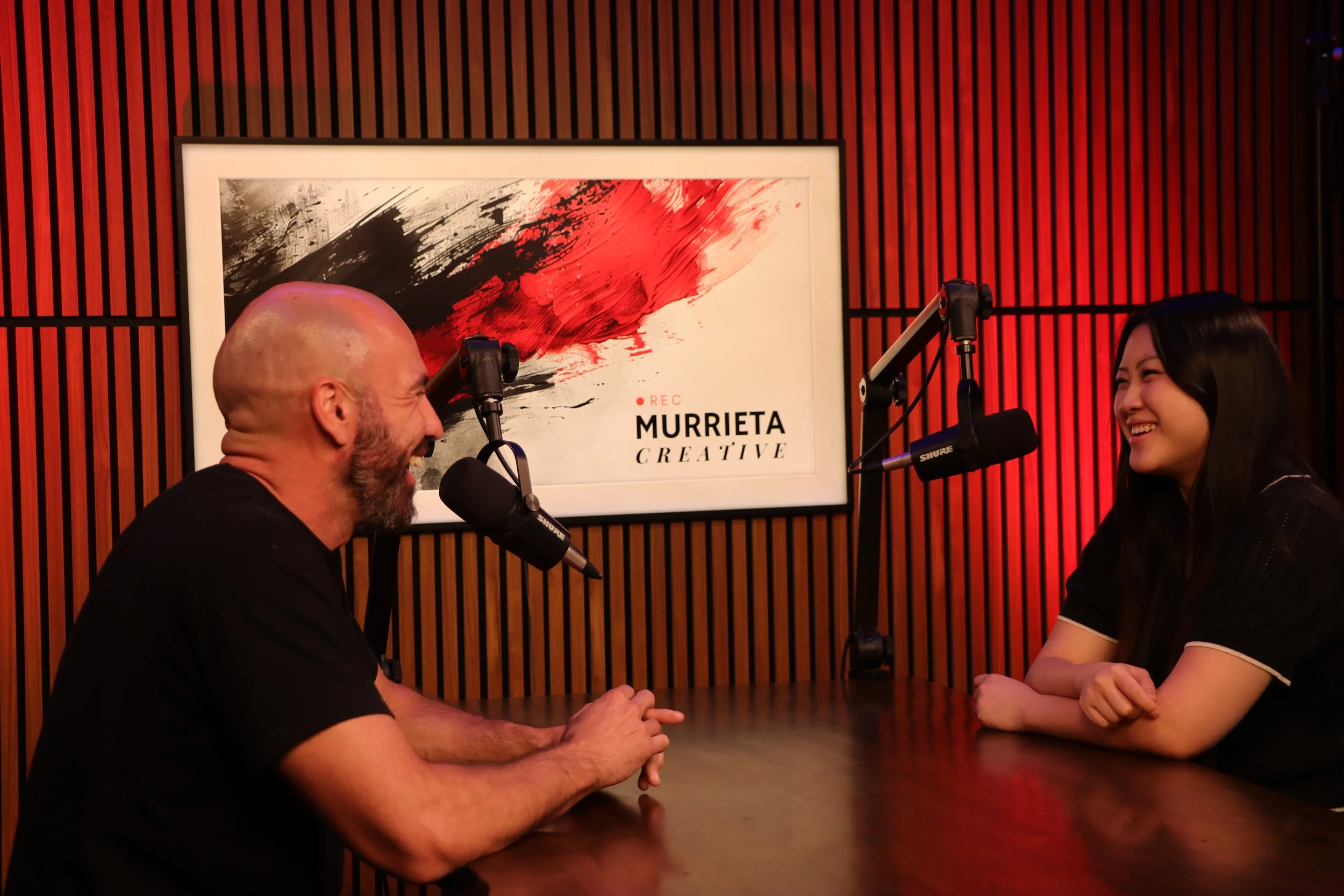New teak wood wall background with a TV available for podcasts, interviews, presentations, etc…